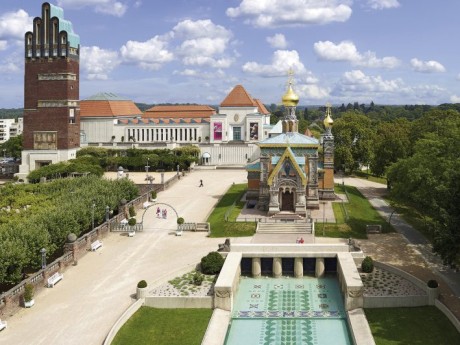 Op de Mathildehöhe bezoeken we de Hochzeitstürm en wandelen langs het museum Künstlerkolonie, Russische Orhodoxe kapel en de Schwanentempel.